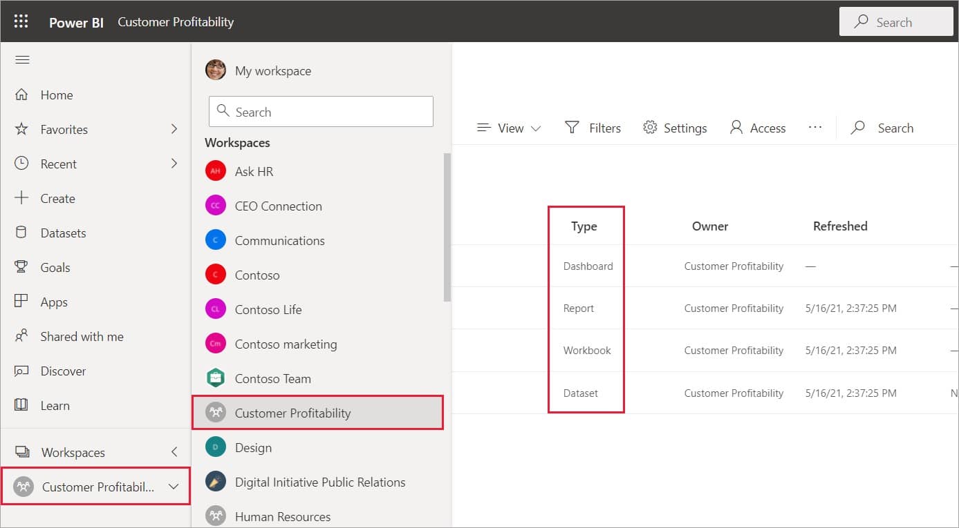 Considering Workspaces, they contain content for a particular app. Because, when an app is designed by a Power BI Designer, he bundles up all the content that can be potentially utilized within an app. This content may include Dashboards, Reports, and Datasets; however, it is not necessary that every app contains all the three content types. An app may contain a single dashboard, couple of datasets or may be only 25 reports. So, it all depends upon the choice of Power BI designer that what he includes in his app. Generally, workspaces for business users does not include any data sets. For example, have a look at a Customer Profitability workspace which is comprised of a report, a dashboard, a dataset and a workbook.