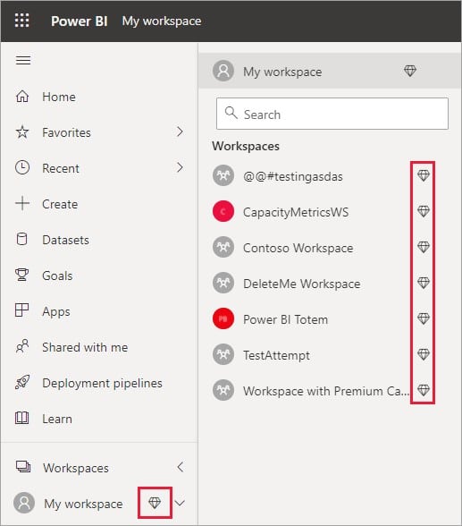 However, Business Users can interact and view with all the content within workspace if it is stored in Premium Capacity. To identify the workspaces that are stored in Premium Capacity, you can find the Diamond Icon in front of them.